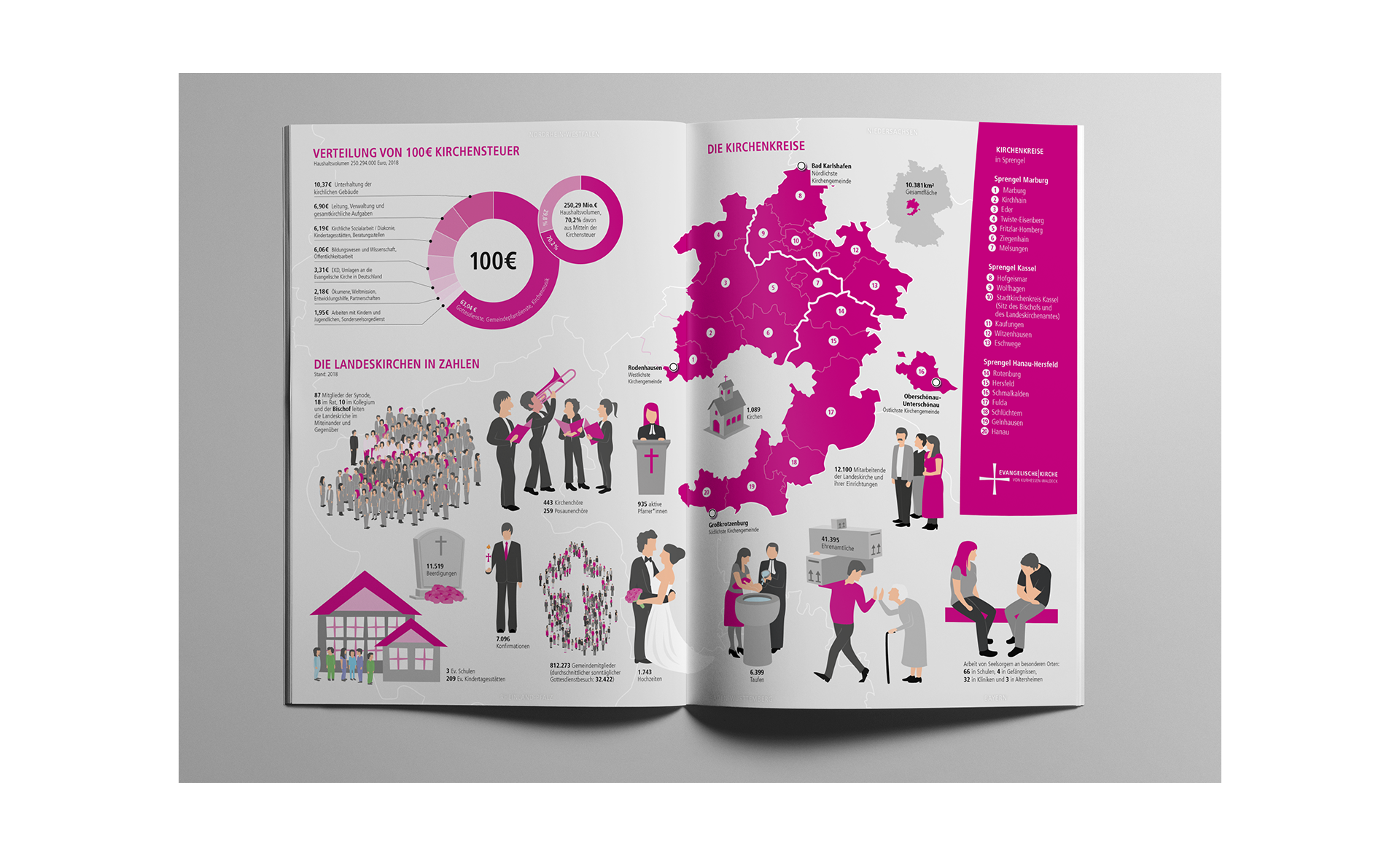 In Anlehnung an die in 2013 gestaltete Infografik für die Evangelisch-Lutherische Kirche in Norddeutschland, entstand zunächst 2017 eine gleichartige Infografik unter Berücksichtigung des CI der Evangelischen Kirche von Kurhessen-Waldecke.