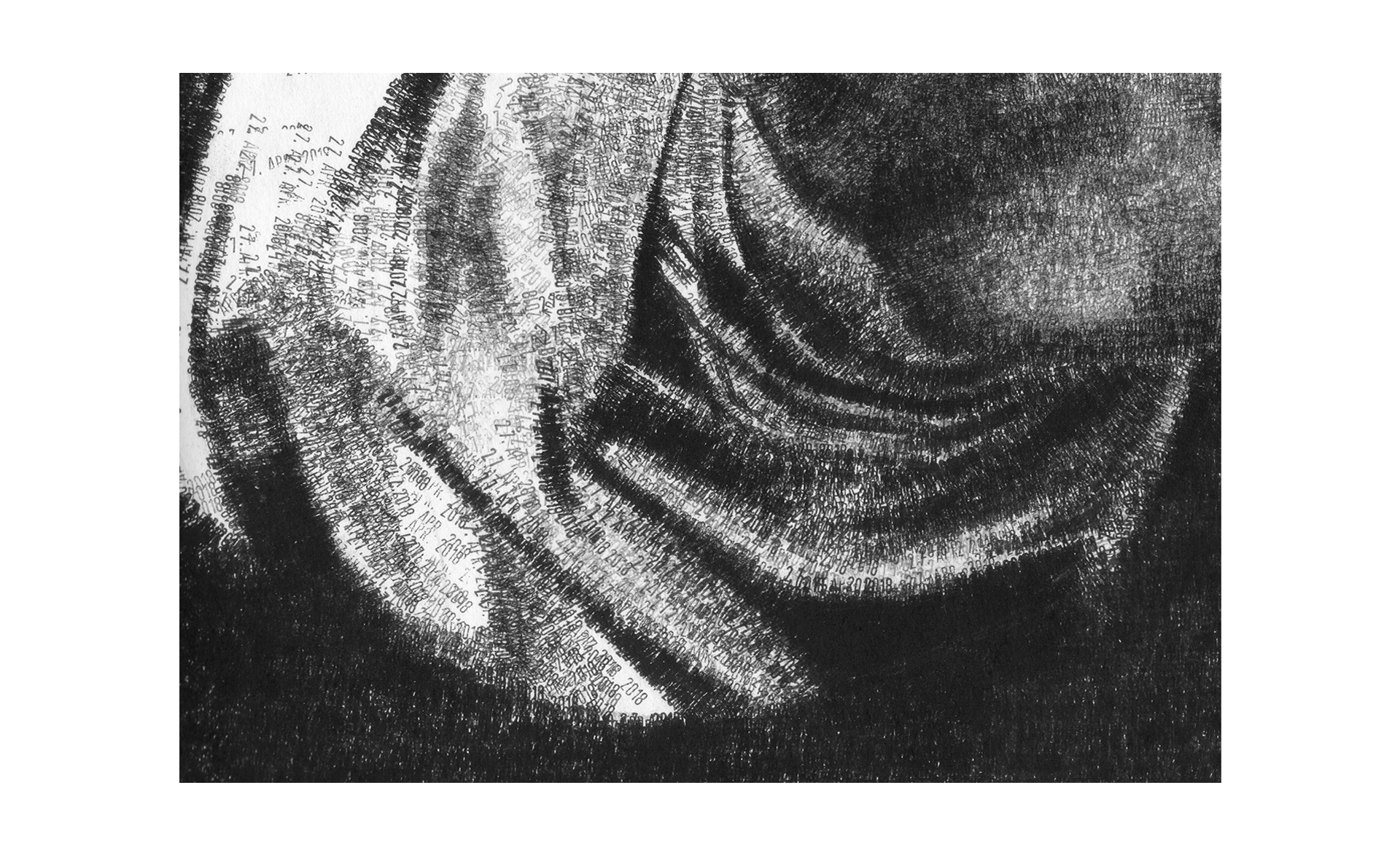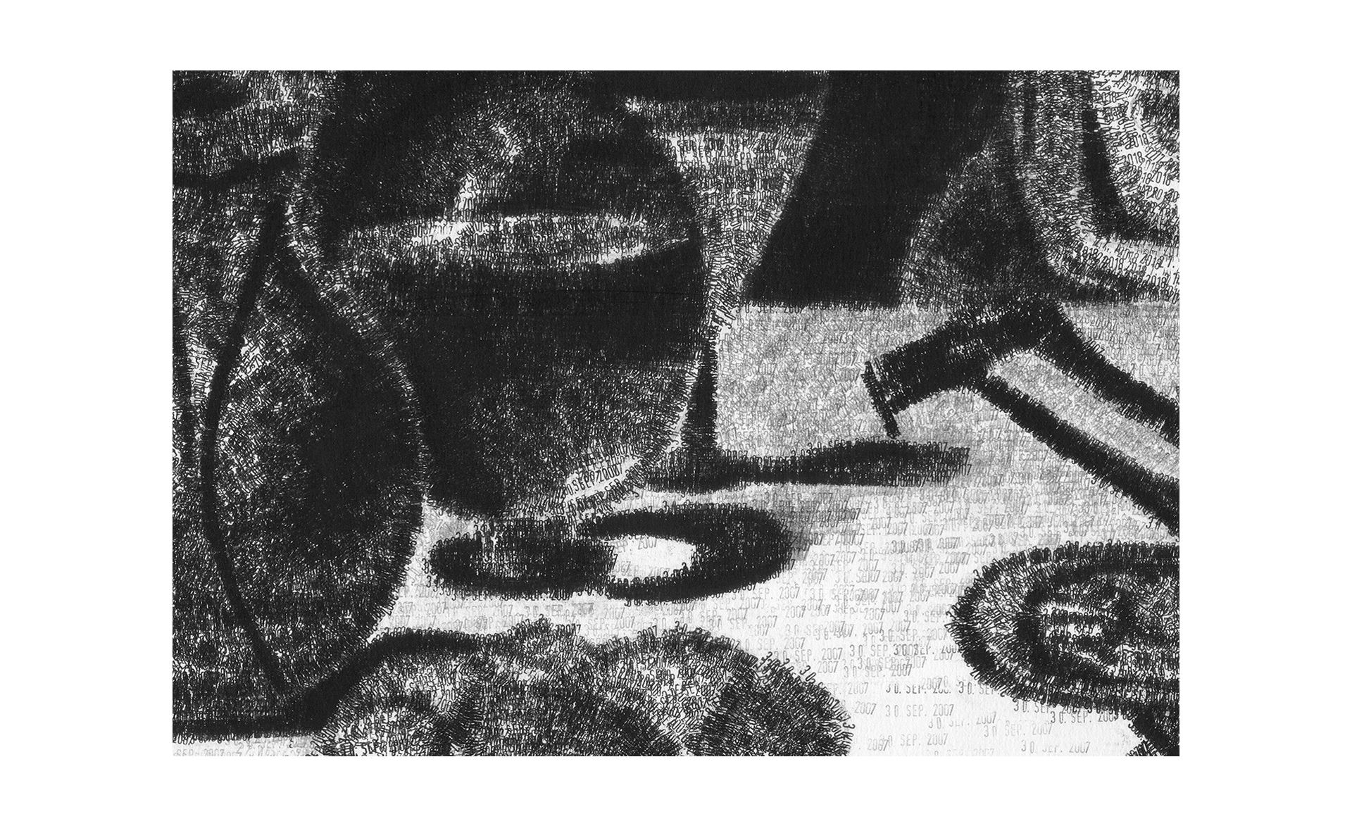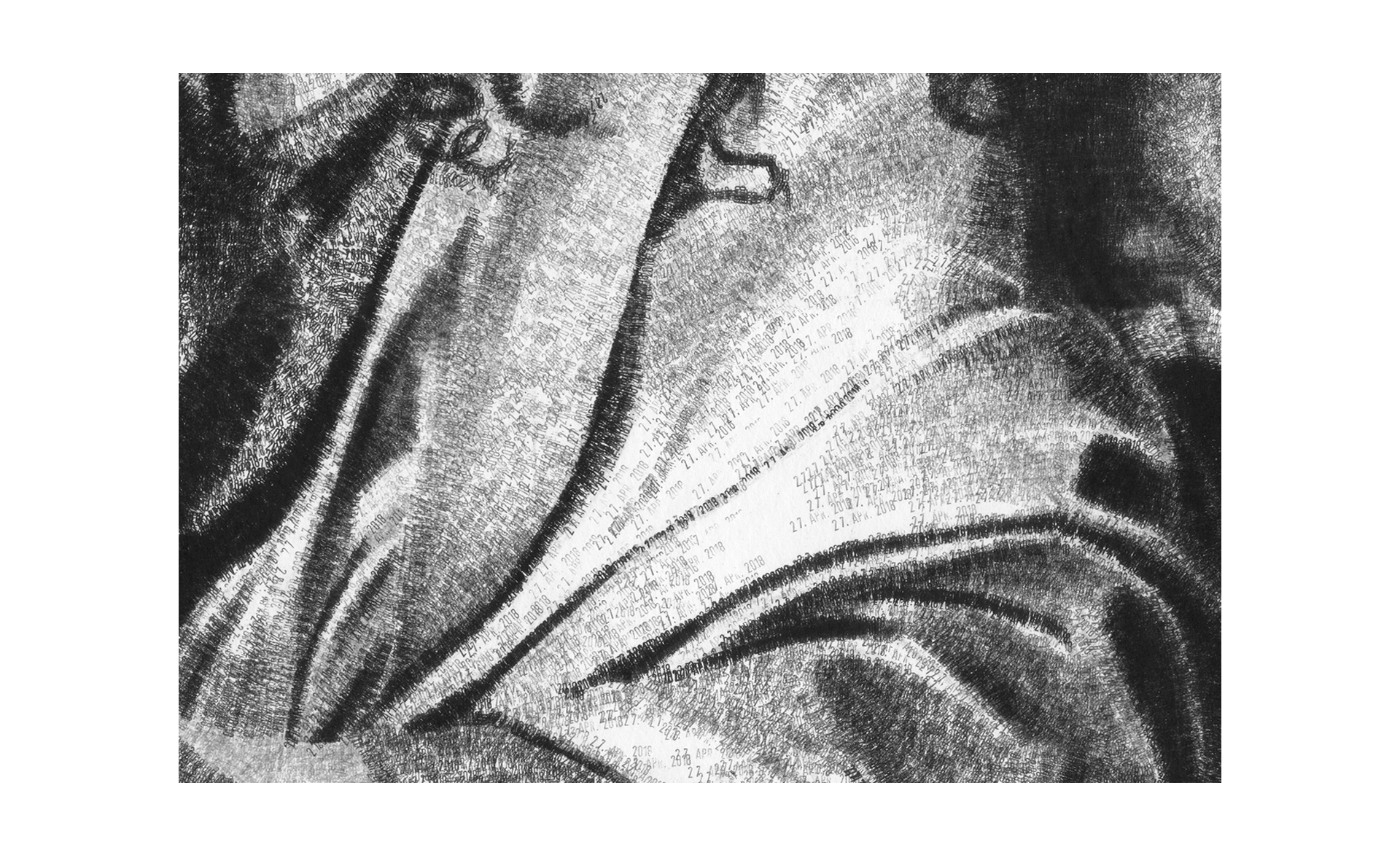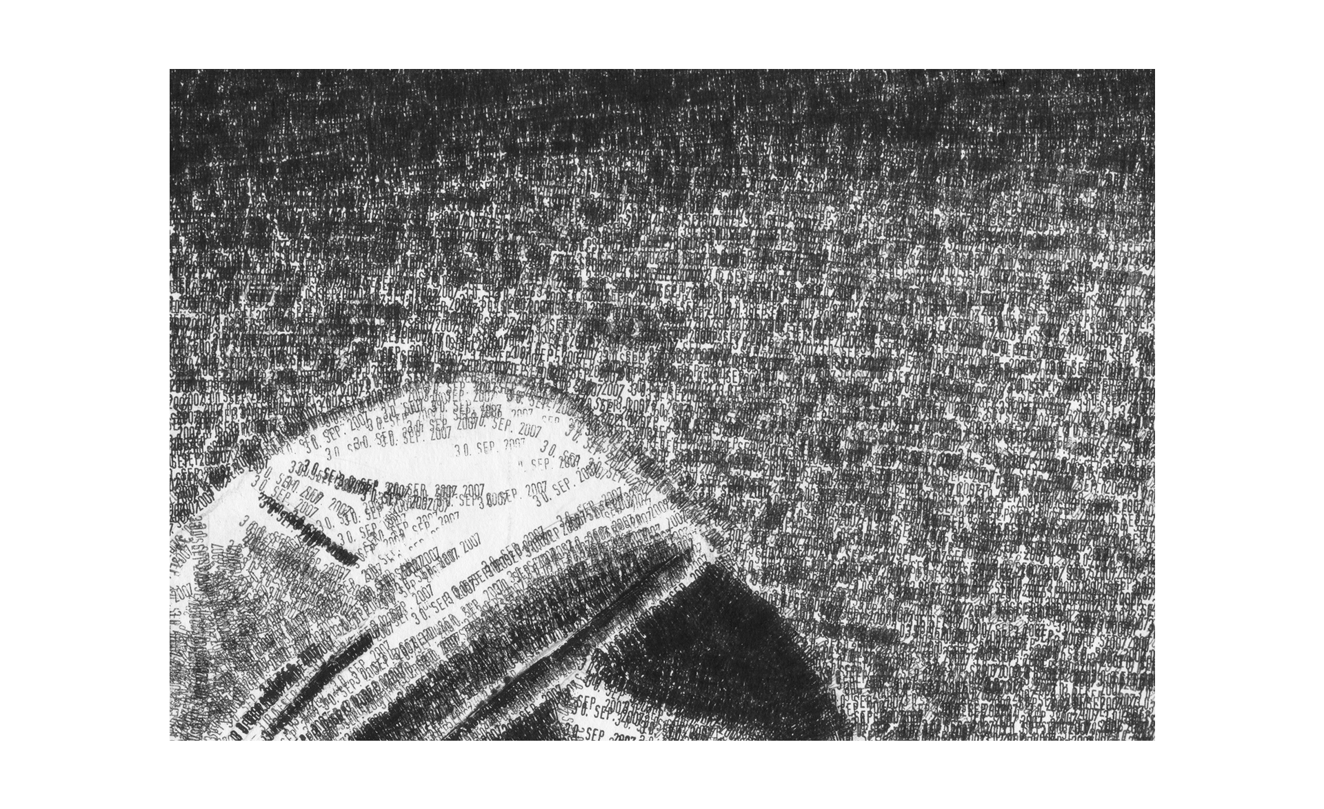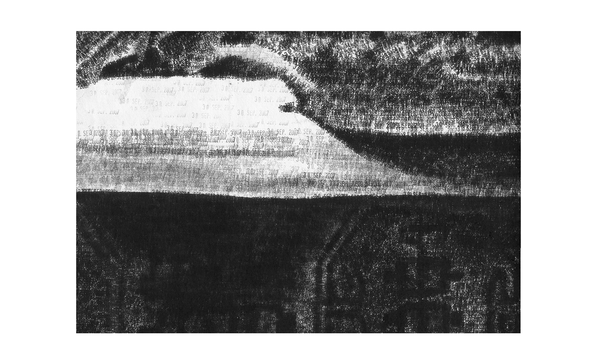 Das Motiv wurde mit einem gewöhnlichen Datumsstempel im Format 200 x 140 cm umgesetzt. Dabei tauchen aber nur zwei unterschiedlichen Daten auf und die Neuinterpretation bedient sich der entstehenden Zeitspanne: der 30. SEP 2007 markiert die Bereiche im Bild, die in der Vergangenheit liegen; der 27. APR 2018 markiert die Bereiche, die zukünftig sind.