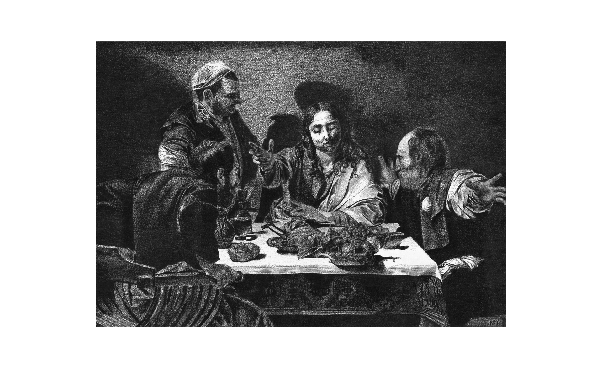 Die erste Ausführung von 1601 des Gemäldes Das Abendmahl in Emmaus von Caravaggio erzählt eine Episode nach der Auferstehung Christi. Zwei der Jünger, die noch immer unter dem Schock der Kreuzigung standen, gingen zum Dorf Emmaus, wo ihnen ein Fremder begegnete und mit dem sie in einem Gasthaus Rast hielten. Bevor sie zu essen begannen, segnete der Fremde das Brot, worauf die Jünger erkannten, dass es Jesus war.